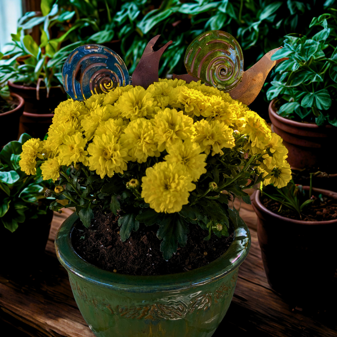Handcrafted with care, these colorful copper snails serve as distinctive plant stakes that insert easily into flower pots. Each snail features vibrant hues and a durable copper finish that naturally ages to develop a unique patina, adding artistic detail to your garden or indoor plants. Combining functionality with decorative appeal, these stakes provide subtle plant support while elevating your botanical display with expert craftsmanship.
